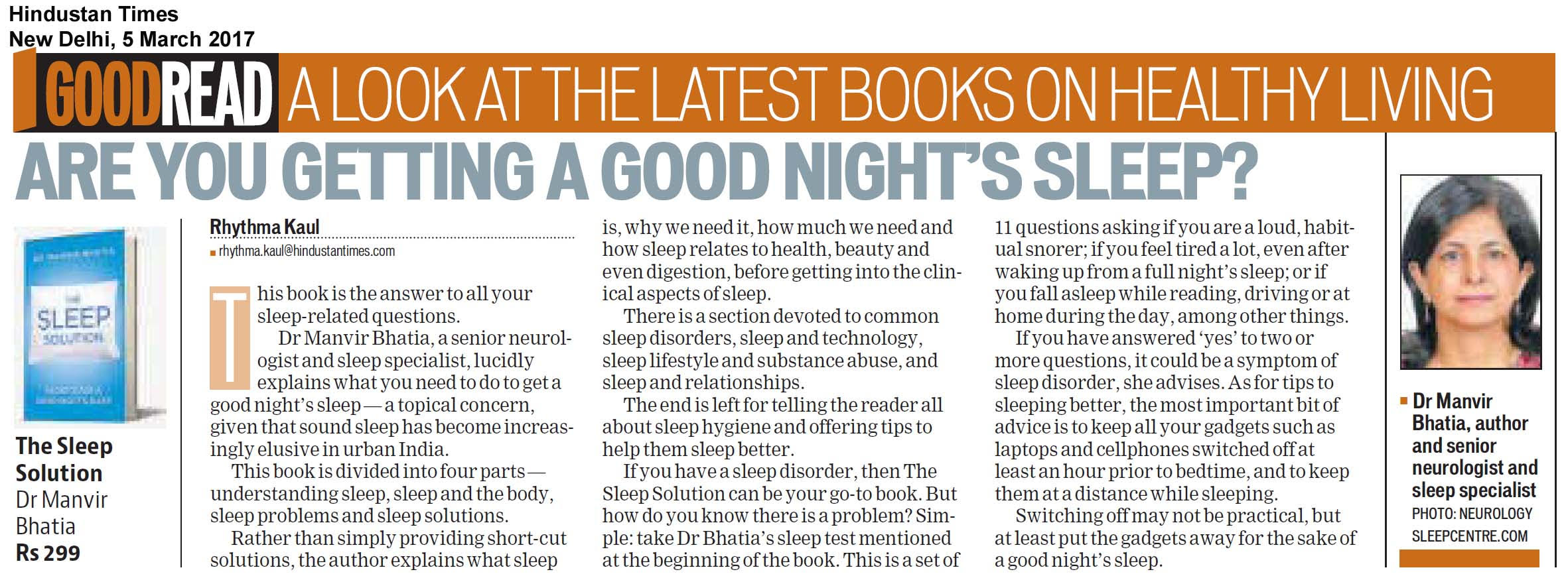 The Sleep Solution by Dr. Manvir Bhatia on 5th March 2017, Delhi in Hindustan Times
